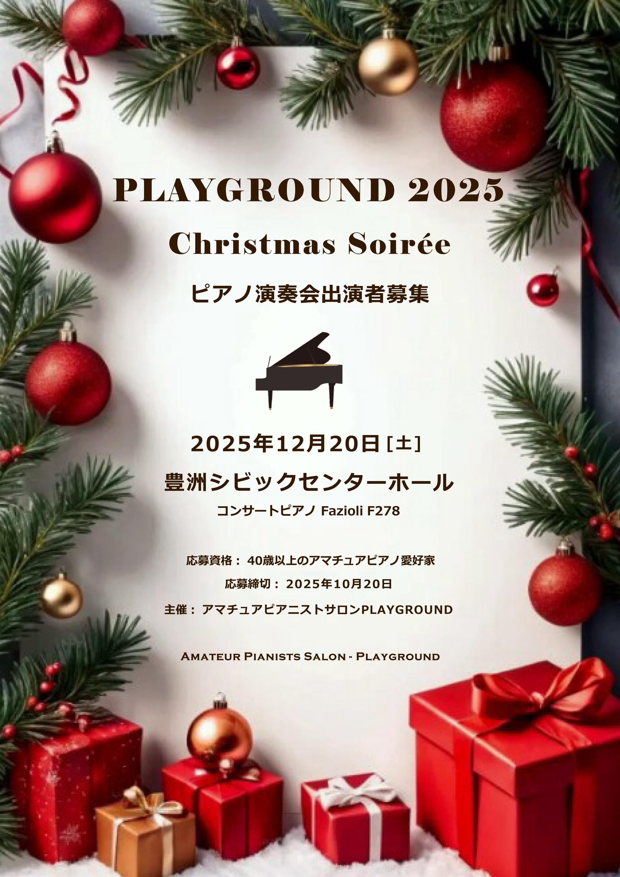 アマチュアピアニストサロンPLAYGROUNDの冬のコンサートの出場者を若干名募集いたします。